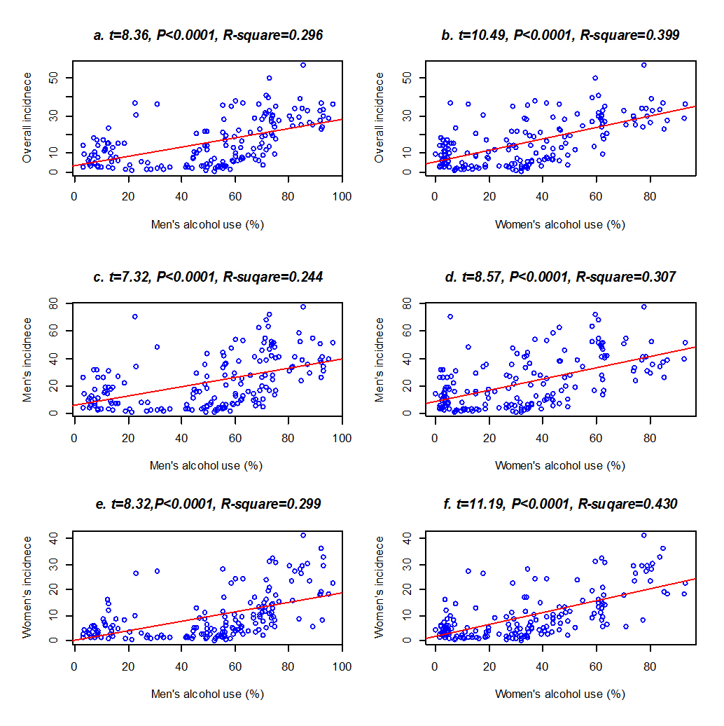 Figure 2. Simple linear regression fitted line on alcohol use in year 2010 and the age-standardized incidence of lung cancer by gender. (a) Fitted results of the overall incidence on men's alcohol use; (b) fitted results of the overall incidence on women's alcohol use; (c) fitted results of men's incidence on men's alcohol use; (d) fitted results of women's incidence on women's alcohol use; (e) fitted results of women's incidence on men's alcohol use; (f) fitted results of women's incidence on women's alcohol use.