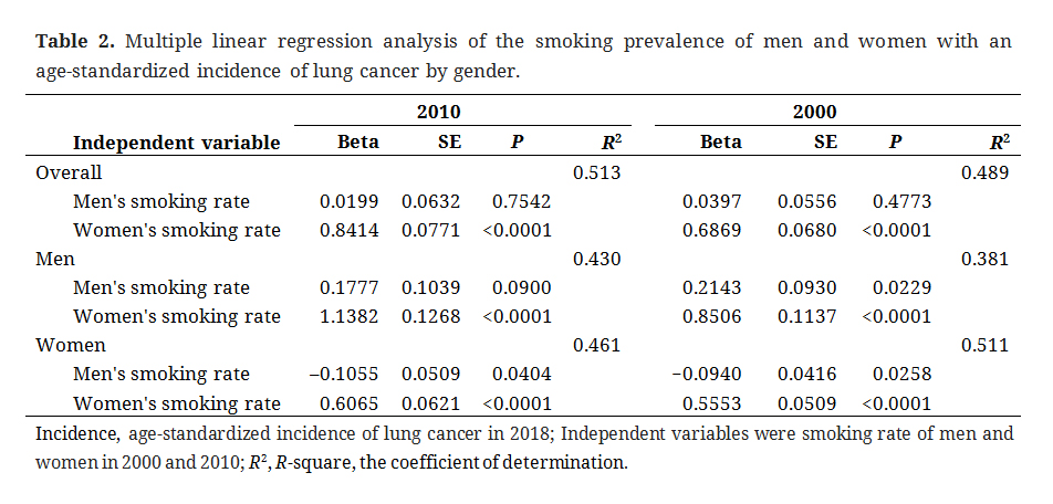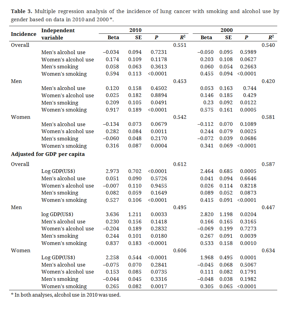 Methods: The dependent variable was the estimate of world age- standardized incidence of lung cancer in 2018. Independent variables included the smoking prevalence by gender in 2010 and 2000, which considered potential latency of lung cancer, the rate of alcohol use by gender in 2010, and the gross domestic product (GDP) per capita in 2010 and 2000. A linear regression model was used for statistical data analysis.