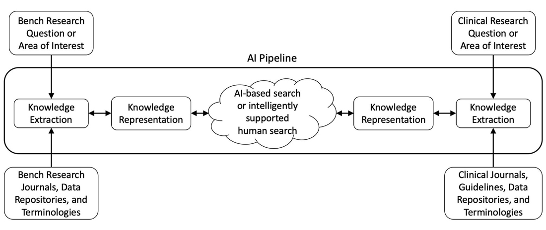 Translational research focuses on moving discoveries made at the bench to clinical care and from clinical care to the bench [4]. However, in practice, translational research is very hard to achieve [5]. This is in part because translational research is multidisciplinary [6]. Here is where an AI system can serve as a bridge between concept models from different disciplines [7]. The specifics of an AI pipeline approach include the integration of knowledge sources, knowledge bases, knowledge linkages, and knowledge extraction that can be crowdsourced by humans and/or AI learners to improve the performance and predictive capabilities of the learned perspectives and knowledge [8]. The sources of knowledge reside in domain experts, research journals, guidelines, and data repositories, and the AI learner could be used to assist in the search for and organization of information to lower the attentional load on researchers. This could build on extant work that extracts meaningful information from clinical practice guidelines using question answering systems such as Watson [9]. Our proposed system is not intended to be a question answer system such as IBM Watson or solely an information retrieval system as described by Sparck [10]. We build on concepts from never ending learning systems [11,12] by combining AI learning with crowdsourcing to identifying bridging concepts among researchers to facilitate collaborations. It is not a general AI approach, but is instead focused on building knowledge representations specific to collaborative research teams.