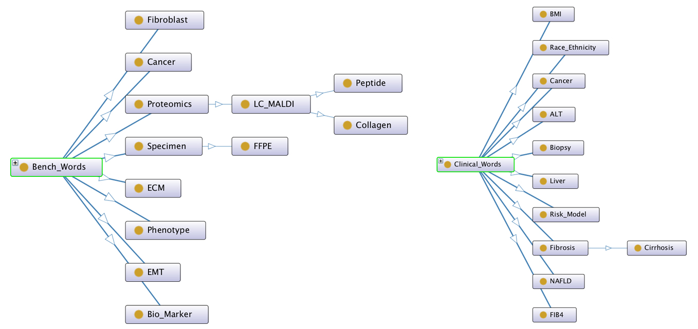 Figure 2. Example of using NAFLD research keywords provided by bench (Left) and clinical (right) researchers to generate knowledge representations.