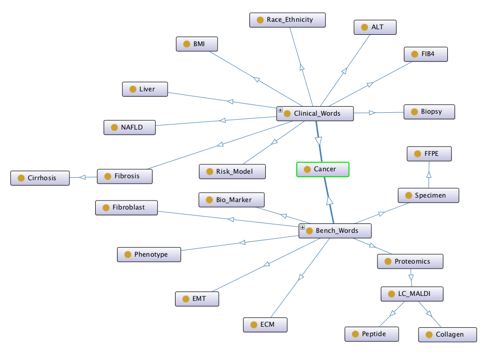 Figure 3. Example collaborative knowledge representation that combines the key words for both clinical and bench researchers with subset relations between the keywords.