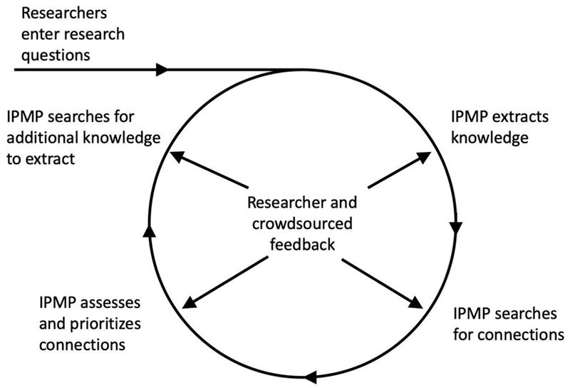 Figure 4. Visualization of IPMP activities. Note the continuous nature of the search with multiple opportunities for interactions with the researchers and (if desired) a larger research community through crowdsourcing.