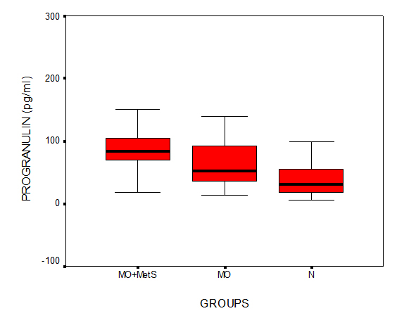The potential links between obesity and cancer need further explanation. Elevated progranulin levels may promote tumor growth. Increased progranulin levels may have an explanatory potential about the link between obesity and cancer. Progranulin excess in peripheral tissues is linked to obesity [54-58]. In our study, it has been demonstrated that progranulin was the only parameter, which shows significant difference among all groups (p ≤ 0.001). These findings emphasize the proinflammatory effect of progranulin and suggest that progranulin may be used as a distinctive marker between NW - MO, NW - MO + MetS, and MO - MO + MetS.