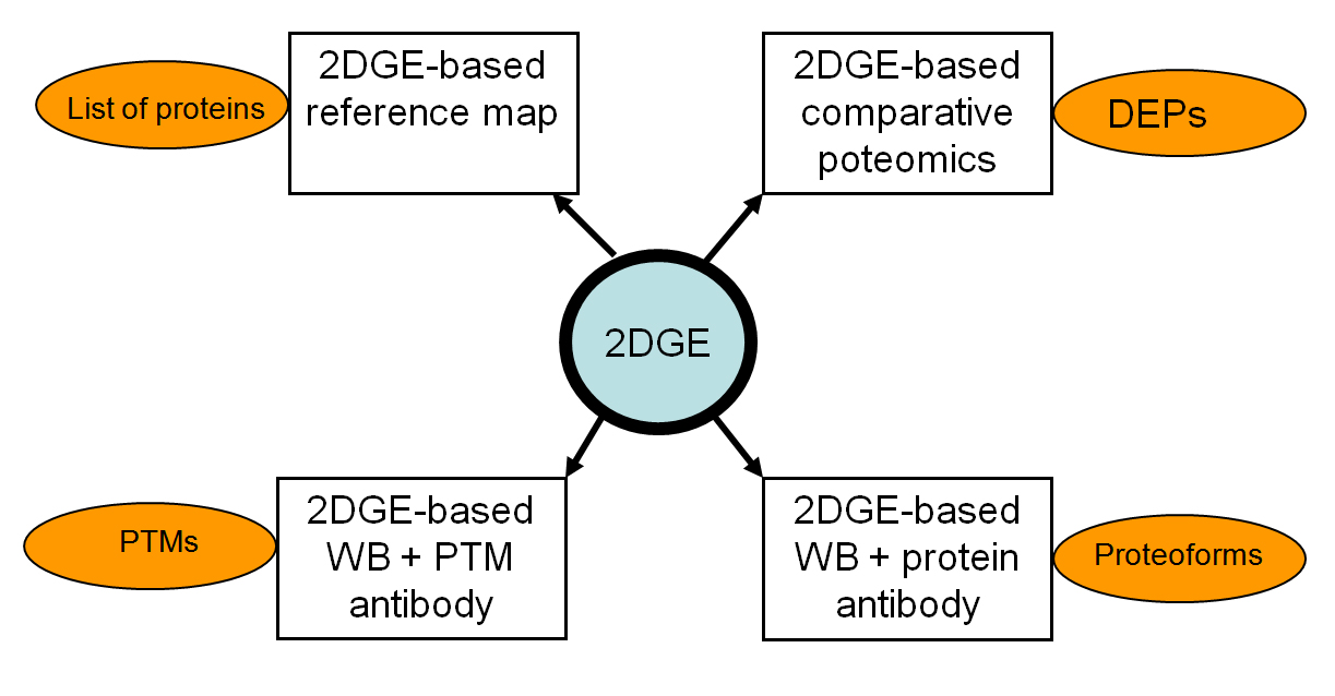 Fig. 1 The main contributions of 2DGE to the field of proteomics. 2DGE = Two-dimensional gel electrophoresis. WB = Western blot. PTM = Post-translational modification. DEP = Differentially expressed protein.