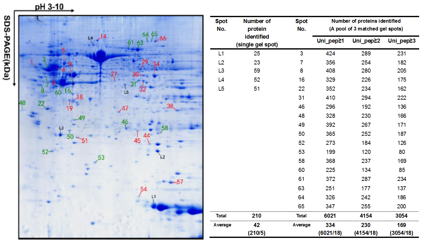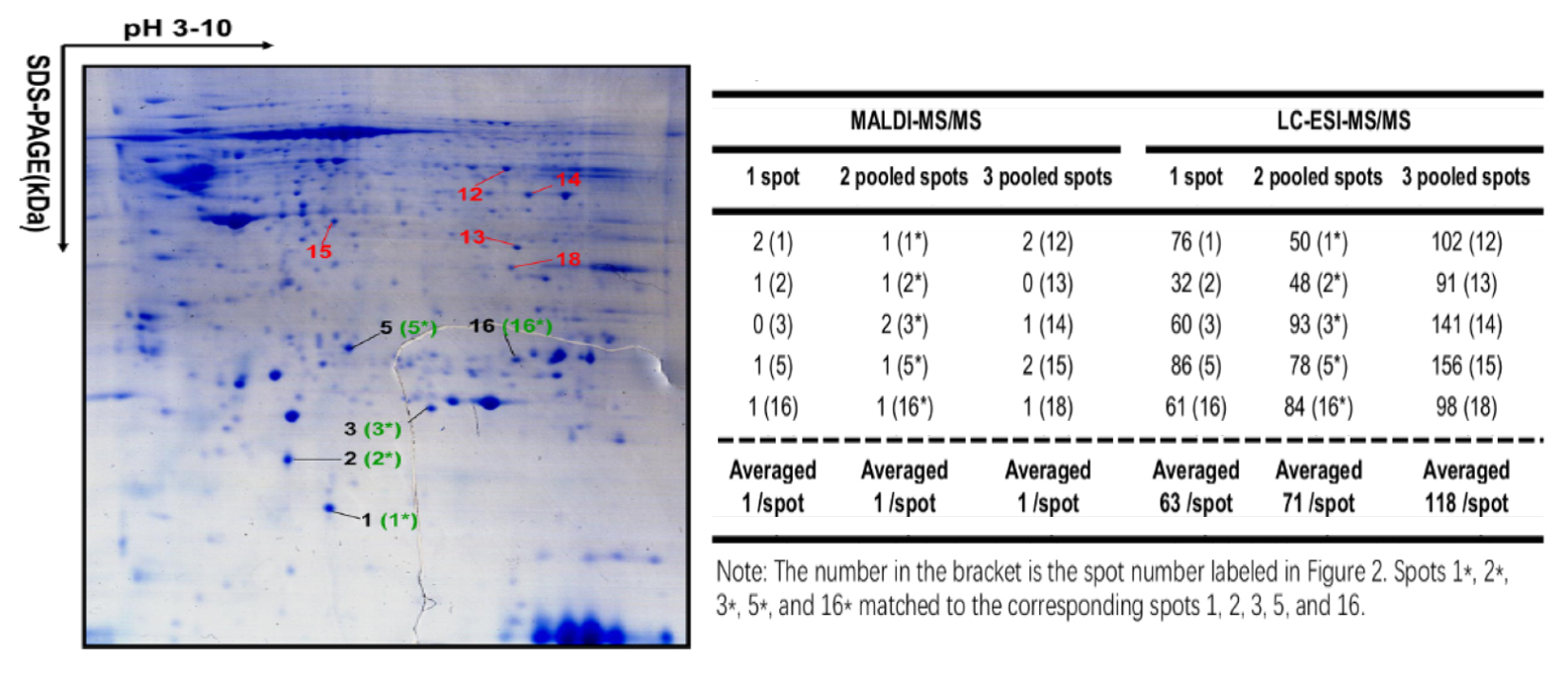 Recently, we integrated 2DGE and high-sensitivity MS to detect and identify the protein components in a complex human proteome [26]. As a result, over fifty or even up to several hundreds of proteins were identified in every 2D gel spot in an analysis of proteomes from complex human pituitary adenoma tissues (Fig. 2) and glioblastoma tissues (Fig. 3). Also, Fig. 2 shows that the number of identified proteins increased with the pooled two spots and three spots compared to the single spot under the identification criteria of two unique peptides. It also showed the reproducibility of the number of identified proteins in the same spots from those replicate gels (spots 1, 2, 3, 5 and 16 versus spots 1*, 2*, 3*, 5* and 16*). Fig. 3 shows the number of identified proteins under the different identification criteria of 1, 2, or 3 unique peptides for each spot. These results broke through the conventional opinion that only one or two proteins per spot are identified for most of the 2D gel spots in a 2DE map, although a few previous publications found that some 2D gel spots contained several proteins [8,9,28,53,81]. These findings challenge the use of 2DGE-based comparative proteomics to determine a differentially expressed protein (DEP) with the difference in spot volume between treatments, because if over fifty or hundreds of proteins are identified, then which one is the real DEP on earth. More importantly, most proteins identified in a 2D gel spot were extremely low-abundance or low-abundance proteins (Table 1), and many proteins were present in several of the analyzed spots to demonstrate the capability of 2DE-MS to separate proteoforms (Table 2). Furthermore, multiple proteins in a 2D gel spot confirm the necessity of isotopic labeling in a large-scale quantification of different proteoforms in a proteome.