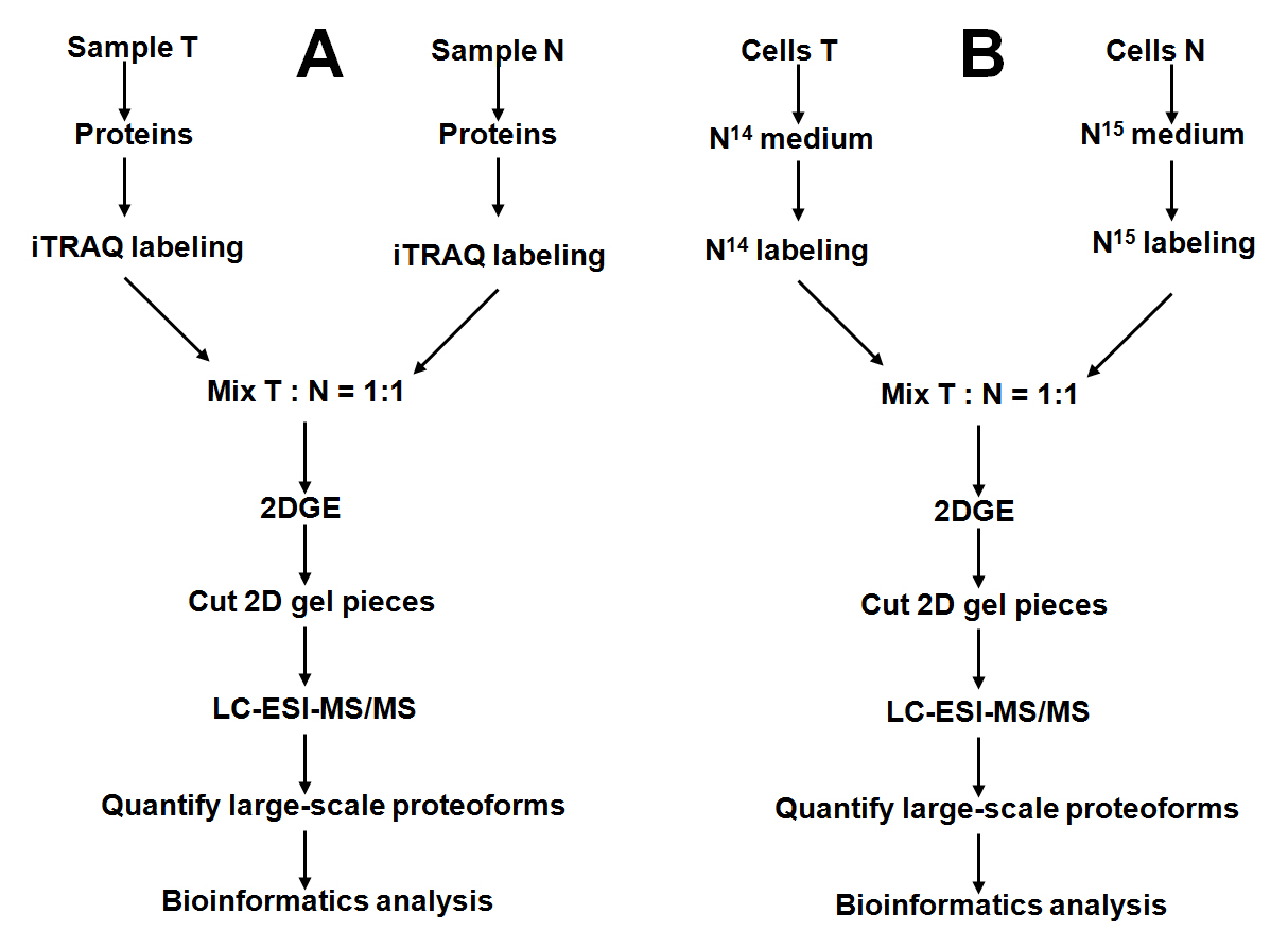 Fig. 5 Brief flow-chart for the use of 2DE-LC/MS in large-scale analysis of proteoforms. (A) 2DE-LC/MS in combination with iTRAQ labeling. (B) 2DE-LC/MS in combination with SILAC labeling. T = Test group. N = control group.