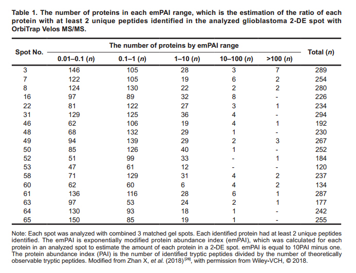 Table 1. The number of proteins in each emPAI range, which is the estimation of the ratio of each protein with at least 2 unique peptides identified in the analyzed glioblastoma 2-DE spot with OrbiTrap Velos MS/MS.