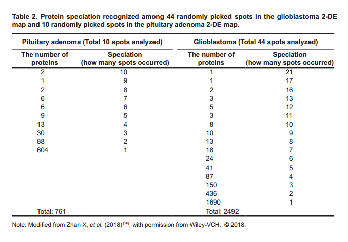 Table 2. Protein speciation recognized among 44 randomly picked spots in the glioblastoma 2-DE map and 10 randomly picked spots in the pituitary adenoma 2-DE map.