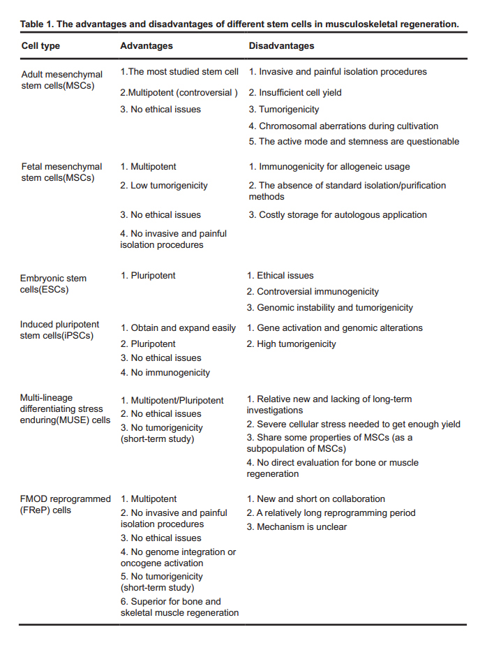 In summary, the advantages and disadvantages of the aforementioned regenerative cell sources are listed in Table 1. In our opinion, although a variety of multi/pluripotent cell sources exhibit potential for use in musculoskeletal regeneration, each of these cell sources has their own obstacles that need to be surmounted before they can be applied on a large scale in clinics. For these reasons, there is still an urgent demand for the development of a safe and easily obtainable cell source for musculoskeletal regeneration.