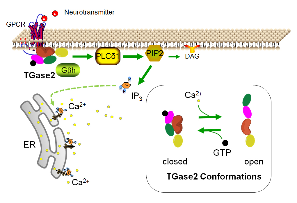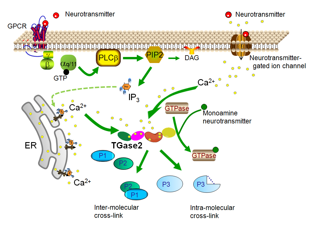 That’s where receptor signaling comes into play. Ca2+ concentrations can be increased in the micro-environment following the stimulation of Gαq/11-coupled GPCRs or neurotransmitter-regulated ion channels (Fig. 2). Stimulation of Gαq/11-coupled GPCRs leads to activation of PLCβ which catalyzes the formation of diacylglycerol (DAG) and inositol 1,4,5-triphosphate (IP3) from phosphatidylinositol 4,5-biphosphate (PIP2). IP3 can bind to IP3 receptors on the ER leading to the release of Ca2+, increasing Ca2+ concentrations to about 1 μM for many seconds [21]. This concentration of Ca2+ is theoretically sufficient to allow TG2 to catalyze transamidation reactions.