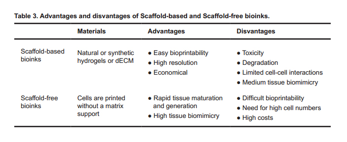 4.5 BioprintingBioprinting technique, earlier called cytoscribing, represents the last frontier in cardiac tissue engineering and could be defined as computer-aided additive biofabrication of 3D cellular tissue constructs [137–139]. This quickly progressing automated technology allows to strictly controlling the micro and macro-architecture of replacement tissues and organs providing high reproducibility and precise control [140]. Up to date, many tissue types, such as bone, vasculature, neural tissue and cardiac muscle, have been created starting from autologous and patient specific primary or stem cells [141–143]. The basic unit of the entire printing process is the so-called “bioink” that has to be biocompatible and stable from a mechanical and structural point of view [144,145]. Generally, the printable material is composed by living cells, such as embryonic, adult, or induced pluripotent stem cells, proteins and other active biological molecules loaded into a matrix, mimicking the ECM. According to their base materials, bioinks could be divided in two principal groups: scaffold-based and scaffold-free bioinks (Table 3) [139,146–148]. In the first group, cells are seeded within natural or synthetic hydrogels, such as collagen, fibrin and polyethylene glycol, or in dECM [146,149]. On the other side, cells in the scaffold-free bioinks are printed without matrix support and the ability to deposit their own ECM is exploited to confer support for cell-cell communication and proliferation to create strands or spheroids [147,148]. Despite the selected bioink, up-to-date three different bioprinting processes are available [150]. The technical gold standards are represented by viability, spreading and proliferation of cells, in addition to the functionality of the bioprinted constructs [151]. Droplet-based bioprinting (DBB), based on a two-dimensional inkjet printing, was the first developed and it is still the most commonly used methodology. Even if DBB is cost-effective and allows obtaining an 85% of bioink-cell viability, the lower resolution, due to the wide-range of drop size (50–300 µm), represents an important technical limitation [152,153]. In the Extrusion-based bioprinting (EBB), bioink is deposited in cylindrical lines, instead of droplets, by a controlled fluidic dispensing system. EBB offers a great flexibility in printing a wide range of bioinks, such as spheroids or tissue strands, with a considerable print speed, encouraging scalability and clinical translation. However, from a practical point of view, the resolution of printed features is still very low and the percentage of cell viability is around the 80% [153,154]. Finally, in the Laser-based bioprinting (LBB), also known as Stereolithography-based bioprinting (SBB), a laser pulse induces the bioink to acquire a drop shape in order to form 3D constructs. Throughout this artifice, it is possible to obtain a higher precision and resolution, mechanical stress is reduced and cell viability stands around the 95% [153]. Unfortunately, at least for the moment, the high costs and the complexity of the laser system make this technology not easily accessible. From a practical point of view, currently bioprinting research for cardiovascular tissue regeneration largely focuses on the myocardium, heart valves, and vasculature [150]. For example, Gaetani et al. evaluated the therapeutic potential of a 3D-printed patch composed of human Sca1+ progenitor cells in a hyaluronic acid/gelatin (HA/gel) based matrix, transplanted in a mouse model of MI. They observed that the application of the patch led to a significant reduction in adverse remodeling and preservation of cardiac performance. Furthermore, the matrix supported the long-term in vivo survival and engraftment of CPCs, which exhibited a temporal increase in cardiac and vascular differentiation markers over the course of the 4 week follow-up period. Overall, they developed an effective and translational approach to enhance CPCs delivery and action in the heart [155]. Wang et al. have recently provided another example of the feasibility of bioprinting in achieving functional cardiac tissues [156]. They integrated isolated neonatal rat ventricular cardiomyocytes in a composite hydrogels preparation and dispensed this bio-mixture to form a string form or patch form. Interestingly, after 1 week in culture, they observed a spontaneous and synchronous beating of bioprinted cardiac tissues and, in parallel, the formation of dense and uniformly aligned heart muscle bundles. Differently, Ong et al. proposed a culture protocol for 3D bioprinting of cardiac tissue without the use of biomaterials [157]. Firstly, they co-cultured isolated cardiomyocytes, endothelial cells and fibroblasts in low attachment 96-well plates leading to the formation of spontaneous beating spheroids. The possibility to create different mixtures, which differ in term of cell type’s percentage, allows obtaining, depending on the purpose, many different types of printed cardiac patches, with distinctive histological and mechanical properties. Furthermore, the innovative feature of this protocol was the possibility to pick up individual spheroids using vacuum suction and position them on a needle array. Accordingly, spheroids could be precisely positioned in any desired configuration and fused together to create a scaffold-free functional 3D bioprinted patch with mechanical integration of component spheroids. As said previously, bioprinting has been explored also for cardiac valve construction in order to enhance physiological characteristics, such as durability or anticoagulation, compared to traditional mechanical and biological prosthesis valve replacements [158]. Therefore, many evidences, underlined how, through bioprinting approaches, it is possible to obtain a better ECM deposition, an upregulation of muscle actin and a strong human aortic valvular interstitial cells (HAVICs) phenotype [150,159,160]. 