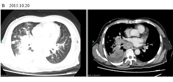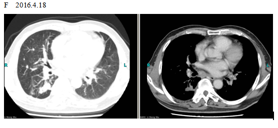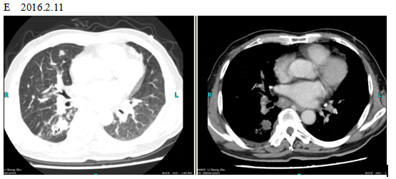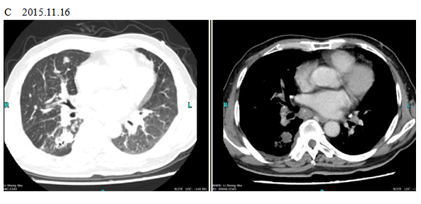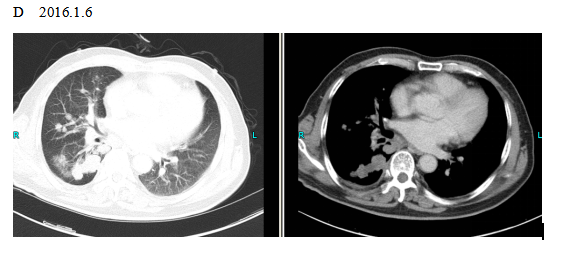 Lung biopsy specimens indicated that there was an EGFR exon 19 deletion mutation. According to the Guideline of National Comprehensive Cancer Network (NCCN) in 2015 [1] reommendations, a therapy program using EGFR tyrosinekinase inhibitors (TKIs) -Gefitinib administration was begun. However, intrapulmonary and extrapulmonary lesions occurred after gefitinib and erlotinib were administered indicating that a primary resistance to EGFR Tki.