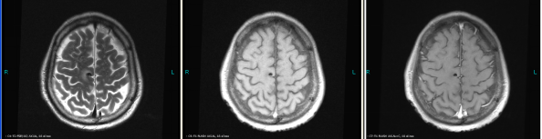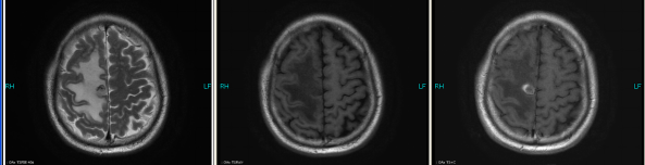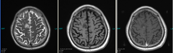 The patient checked for further treatment on November 23, 2015. A pre-chemotherapy assessment was made and the results showed multiple bone metastases and multiple enlarged lymph nodes in the left shoulder blade, the fourth lumbar, the right iliac bone and other locations. Performance status (PS) was only one point. Pemetrexed Disodium (500 mg/m2 d1) + Carboplatin (AUC 5 d1) + Bevacizumab (7.5 mg/Kg d1) was administered beginning November 26, 2015 for the chemotherapy treatment and supportive therapy was provided, such as, dehydration, reduction of intracranial pressure, promotion of bone repair, pain relief, and waist protection. After discharge, the coughing basically disappeared and the dizziness, backaches, and hemiparesthesia of the left side were significantly improved. Patient emotional state and sleep quality was significantly improved. It was basically normal after a routine blood examination. A second chemotherapy treatment was successfully completed on December 18 (the program is idem). The patient returned to the hospital on January 6, 2016 and was proposed for a third chemotherapy. The pre-chemotherapy assessment showed that the measurable, targeted right lung lesion had decreased (3.2 mm, with a rate of decrease 44.8 %) (Fig. 1D). Lymphangitis carcinomatosa was significantly decreased and right frontal nodulus lesions were reduced significantly (Fig. 2C). No new lesions were found. Efficacy was assessed as partial relief (PR). A third and fourth chemotherapies were completed on January 9 and January 30, 2016. Efficacy was re-assessed as PR (Fig. 1E) with lung CT review as an outpatient on February 11. Since then, the patient had been subjected to a combined administration program of pemetrexed disodium (500 mg/m2 d1) + bevacizumab (7.5 mg/Kg d1) for continued chemotherapy. A lung CT and a cranial MRI were peformed on April 16. The results showed that the control of lung lesions and intracranial lesions were basically the same as before (Fig.1F and Fig. 2D). The patient had no cough, backaches, or hemiparesthesia and the quality life significantly improved. PS was decreased to zero.