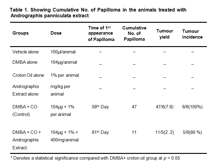 Table 1. Showing Cumulative No. of Papilloma in the animals treated with Andrographis panniculata extract