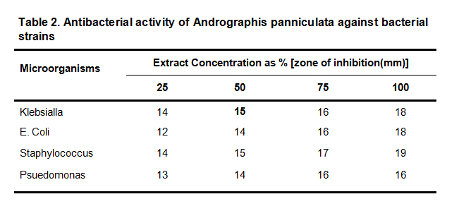 Andrographis panniculata leaves at the different concentration (25 %, 50 %, 75 % and 100 % exhibited antibacterial activity against and E. coli, Klabsella, Staphylococcus and Psuedomonas (Table 2).