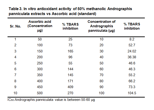 Andrographis panniculata leaves in vitro antioxidant activity was tested in various concentrations against ascorbic acid as the standard. Percentage of TBARS was calculated for both ascorbic acid and Andrographis panniculata extract, with the help of formula, for a comparative study. TBARS percentage was calculated and plotted in the graph in different concentration (Table 3).