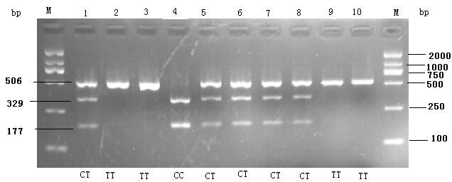 If -509 locus (-CTTC-) existed in the amplified fragments, the interchange between thymine (T) and cytosine (C) might appear at the -509 locus (-CTTC-), a Bsu36l endonuclease locus would be generated, and produce two fragments: 329 bp, and 177 bp after Bsu36l endonuclease digestion. TT geneotype had only one fragment (506 bp), CC genotype had two fragments (329 bp and 177 bp), and CT genotype had 3 fragments (506 bp, 329 bp and 177 bp) (Fig. 1).