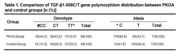 Table 1. Comparison of TGF-β1-509C/T gene polymorphism distribution between PKOA and control groups [n (%)]