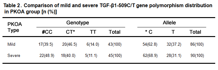 Table 2. Comparison of mild and severe TGF-β1-509C/T gene polymorphism distribution in PKOA group [n (%)]