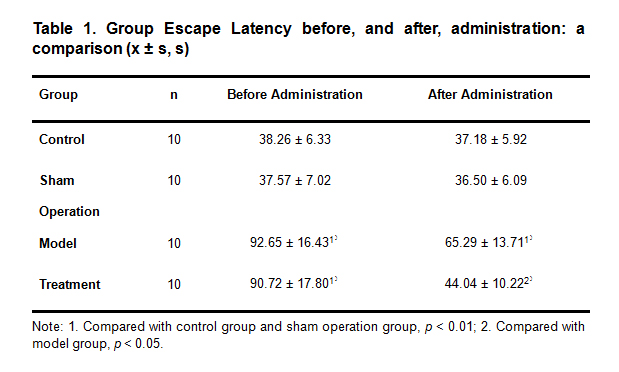 The tests of escape latency via the Morris water maze show a significant extension of escape latency in the model, and treatment, groups before administration. The difference is statistically significant compared with the results of the control, and sham operation, groups (p < 0.01). Compared to the model group, treatment group latency is significantly shortened after administration (p < 0.05). See Table 1.
