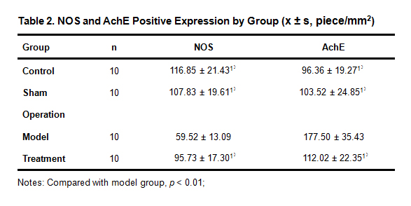 Results: Rat escape latency was significantly longer after modeling (p < 0.010). Compared to the model group, treatment group escape latency was significantly shortened and the difference was significant (p < 0.05). NOS and AchE positive expression mainly reflects in hippocampus region tissue. Compared with the control, and sham, operation groups, NOS positive expression decreased and AchE positive expression increased in the model group. The difference was statistically significant (p < 0.01). Compared with the model group, NOS expression in the treatment group increased and AchE expression decreased. The difference was significant (p < 0.01).