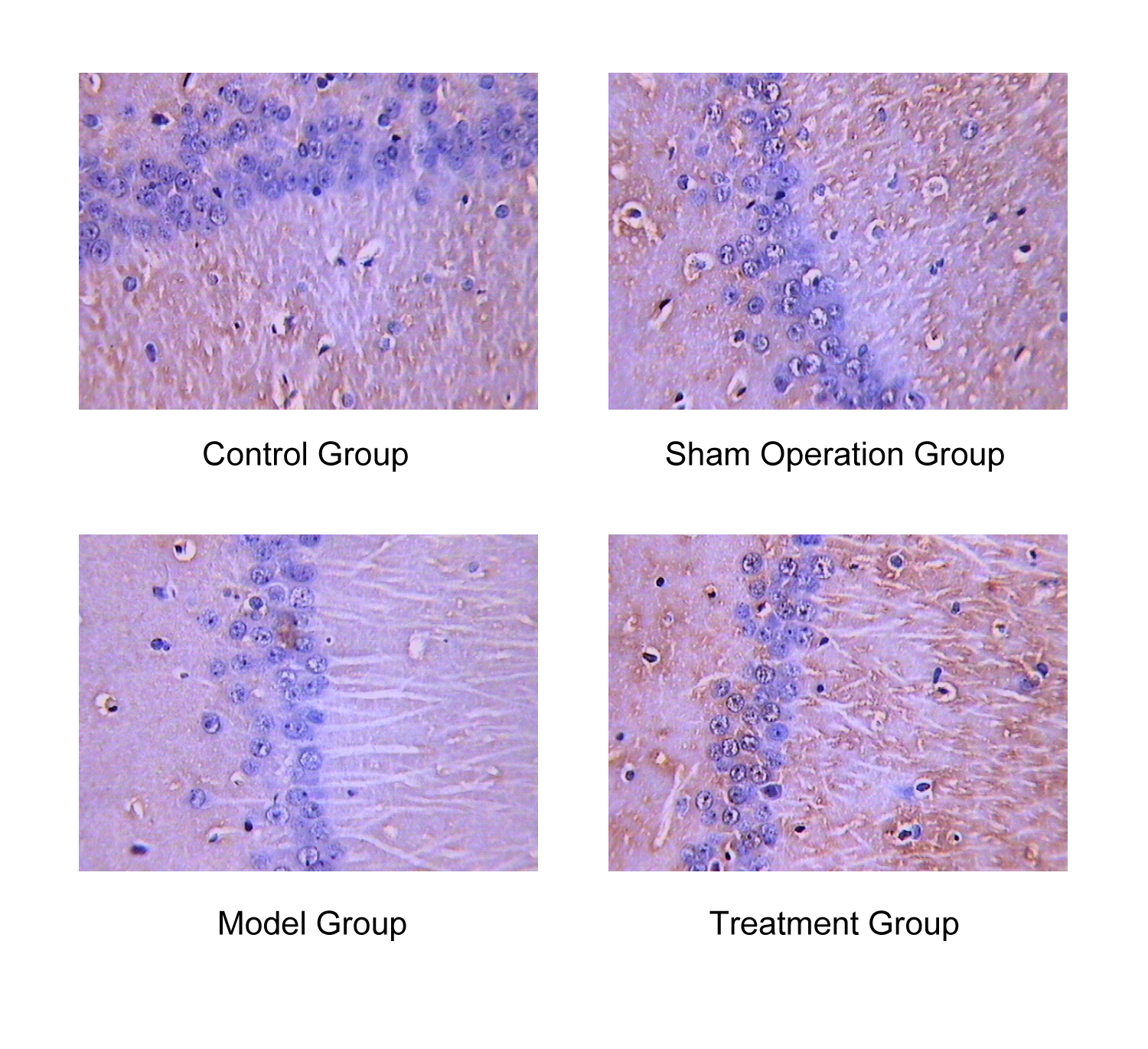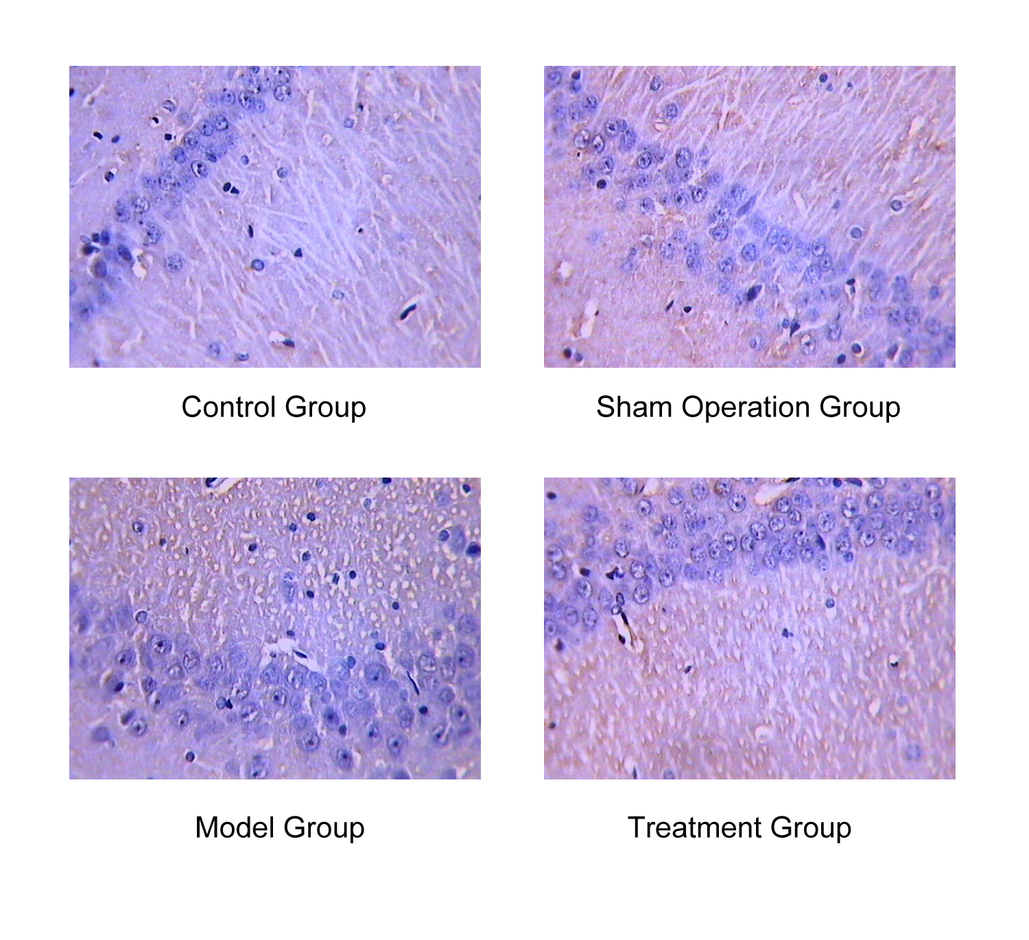 NOS and AchE positive expression by group was detected using immunohistochemistry. A chocolate brown, or brownish yellow, stain in neuronal cell cytoplasm, or protrusions, are positive. The main expression area is in hippocampus. NOS expression in the model group decreased while AchE expression increased, indicating a statistically significant difference compared with the control, and sham operation, groups (p < 0.01). After drug administration, NOS expression in the treatment group increased and AchE expression decreased, which indicates a statistically significant difference compared with the model group (p < 0.01). (Table 2 and Fig. 1 and 2).