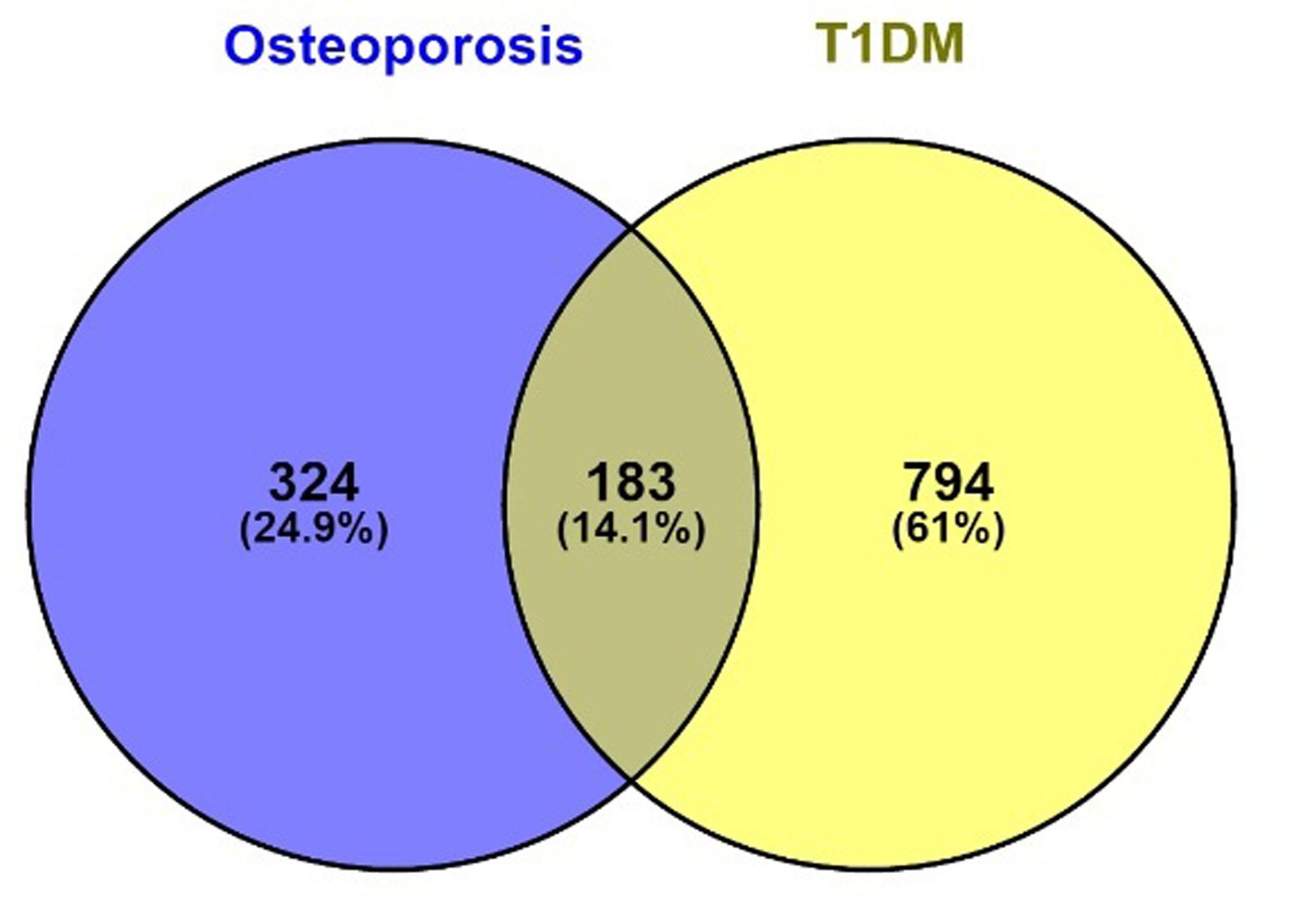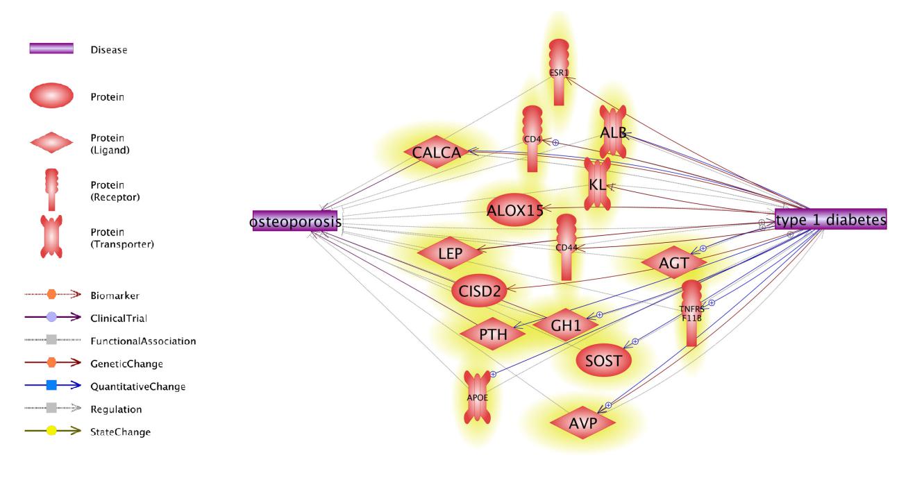 In recent years, Pathway Studio ResNet database has been widely used to study modeled relationships between proteins, genes, complexes, cells, tissues and diseases [13] . In this study, we hypothesized that genetic associations exist between T1DM and OP, and that some genes play roles in the development of TIDM may also influence OP pathogenesis. To test the hypothesis, large scale ResNet relation data and gene expression data were integrated to study the shared genetic basis between TIDM and OP, with the purpose to identify potential OP risk genes.