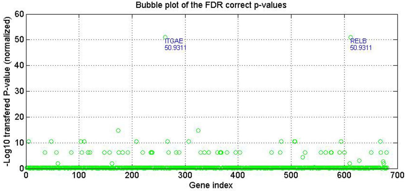 The p-values have been through FDR correction with q = 0.05 and normalized logic transformation using ‘–log10’. Names of 2 genes demonstrating significant differences (p-value < 0.0005) were marked at corresponding positions.