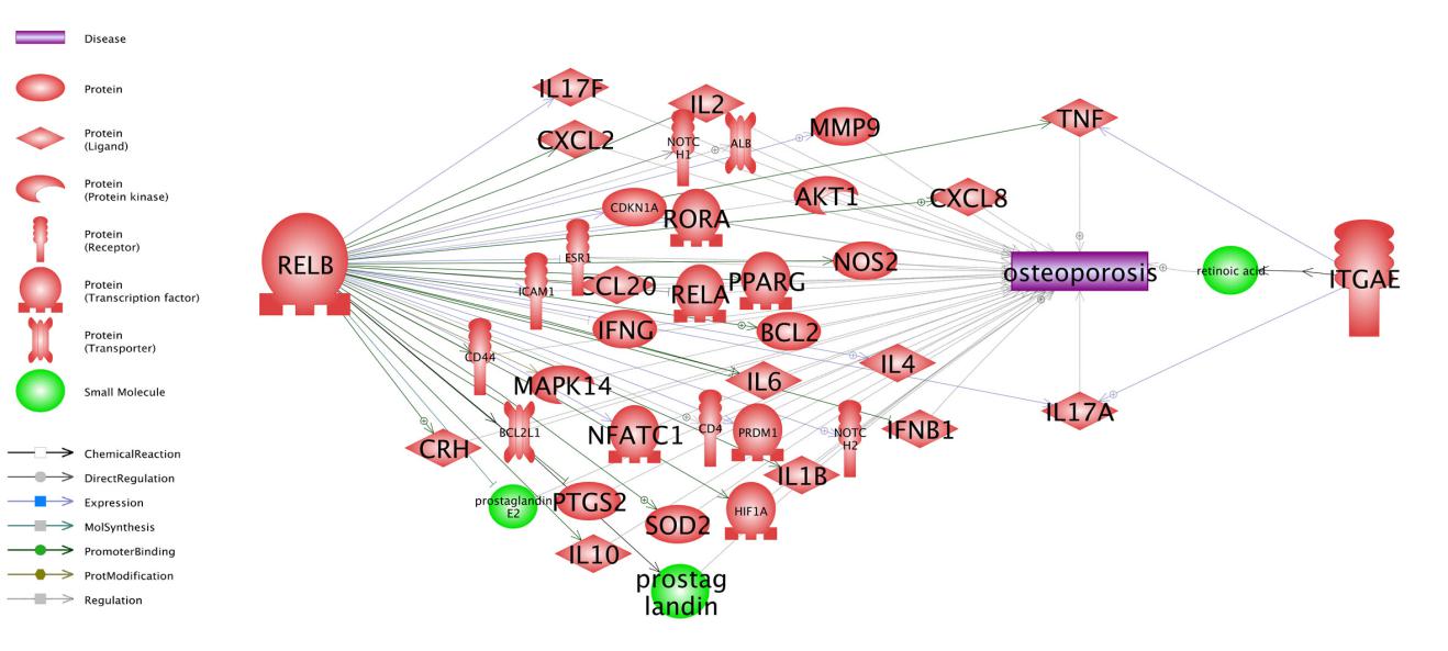 Closer study of the 794 T1DM alone genes (Fig. 1 (a)) using OP gene expression data showed that two genes, ITGAE and RELB, demonstrated significant difference between OP cases and controls (p-value < 0.0005, NLP = 50.93; in Fig. 3. Further validation using ResNet network analysis showed that, these two genes presented strong functional correlation with OP, forming a functional genetic network supported by 474 supporting references (Fig. 4 and Supplementary Tables S6b). Specially, RELB presented strong correlation with OP through 38 genes/proteins and 2 small molecules. Where there are there two genes and one molecule linking it to OP. The network analysis revealed multiple potential pathways through which ITGAE and RELB may affect the disease status of OP. In additionally, the RELB is essential for the regulation of IL17A production in GD T cells [23] , while IL17A mediated sRANK ligand elevation is involved in postmenopausal OP [24] . These findings indicates a possible RELB IL17AOP regulatory pathway. A possible ITGAE TNF OP regulatory pathway was identified as follows. ITGAE coded integrin protein CD103 (cluster of differentiation 103) expresses in many dendritic cells (e.g., CD103-DCs), influencing the production of tumor necrosis factor alpha (TNF-α) [25] , which plays a pivotal role in inflammation-related OP through the promotion of bone resorption and suppression of bone formation [26] . These observations suggest a possible TNF-α pathway via which ITGAE may regulate OP. More potential connections between these two genes and OP could be identified in Supplementary Tables S6b.