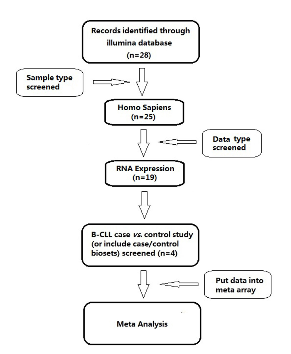 A systematic search of electronic databases was conducted using Illumine BaseSpace Correlation Engine (http://www.illumina.com). Fig. 1 presents the diagram for the data selection. The ‘B-cell chronic lymphocytic leukemia’ search result identified 28 B-CLL studies. Further filter criteria included: (1) the organism is Homo sapiens; (2) the data type is RNA expression; (3) the study is B-CLL case vs. healthy control study (or include case/control bio-sets). In total, 21 bio-sets (B-CLL case/control comparisons) from four studies satisfied the study selection criteria and were included in this systematic review and meta-analysis.