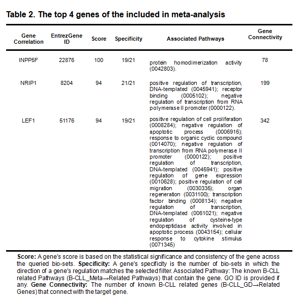 Nevertheless, there are several limitations of this meta-analysis. The number of B-CLL patients and healthy controls were not well match (195 B-CLL cases and 31 controls). The unbalanced case/control comparison may influence the accuracy of the results. Additionally, due to the limitation of the space, we mainly focused on the most significant genes (Gene Score > 90). Genes with less significance from this meta-analysis may also poses potential linkage to B-CLL. One could refer to the full gene list of 100 top genes of this meta-analysis, which is presented in the database B-CLL_Meta.
