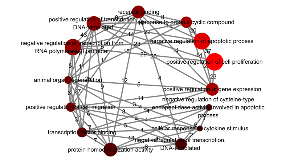 Out of the three genes listed in Table 2., only one gene were not included in the database B-CLL_GD (NRIP1), which suggested that it may be a novel B-CLL risk gene. Further study using the B-CLL_GD showed that, this novel gene was enriched within multiple B-CLL target pathways and was connected to many other genes that were linked to B-CLL (Table 2., B-CLL_Meta → Related Pathways). Fig. 2 shows the 14 B-CLL pathways including these three genes. To note, two of these 14 pathways were among the top 10 B-CLL pathways (B-CLL_Meta → Related Pathways), including positive regulation of cell proliferation (0008284) and negative regulation of apoptotic process (0006916), as shown in Fig. 2.