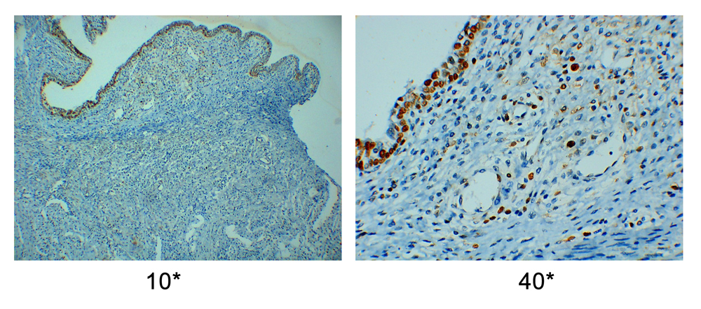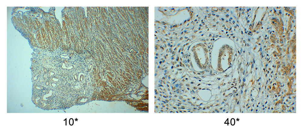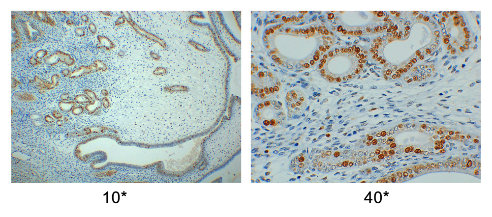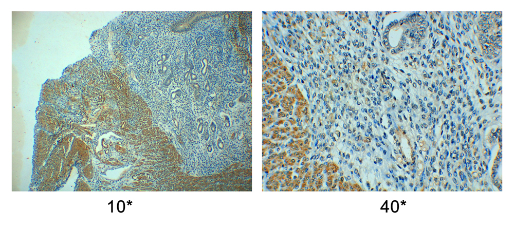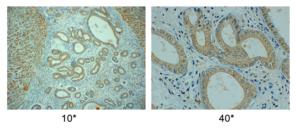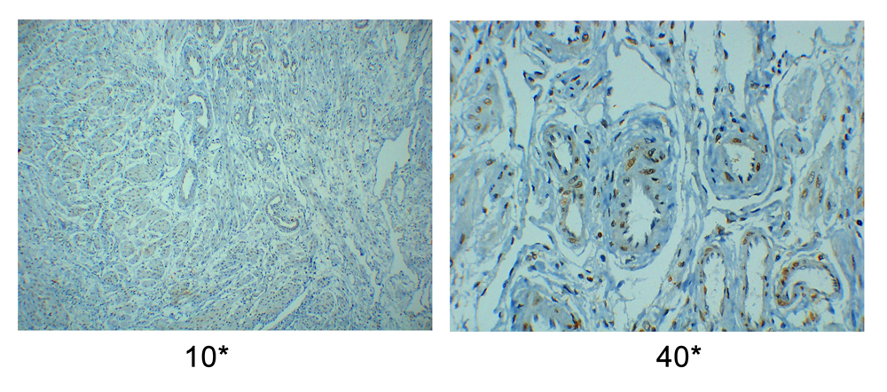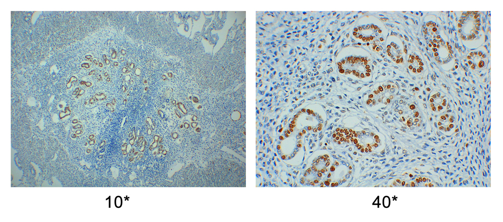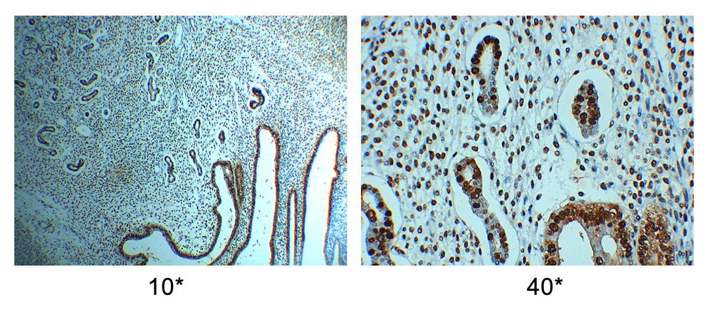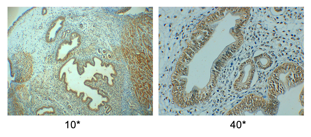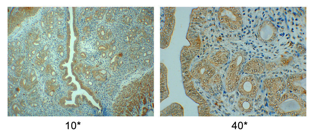 Recent studies show that PCNA is a marker reflecting cell proliferation activities and plays an important role in DNA replication as an auxiliary protein of DNA polymerase δ. It is an acidic nuclear protein with a molecular weight of 36KD [6]. Jeff R, et al. found that the PCNA gene was subject to up-regulated expression in periimplantation endometriums. It is speculated that PCNA is involved in endometrium proliferation and endometrial decidualization during germ cell adhesion and invasion into the endometrium [7]. This study suggests PCNA protein expression in control, and drug, group endometriums was significantly lower than in young group. This indicates that, during perimenopause, PCNA protein expression in the endometrium is affected. After Kuntai capsule administration, PCNA protein expression in mice endometrium increased significantly suggesting that the contents of Kuntai capsules may significantly alleviate negative effects on the perimenopausal endometrium. This effect also increased with Kuntai capsule dosages.