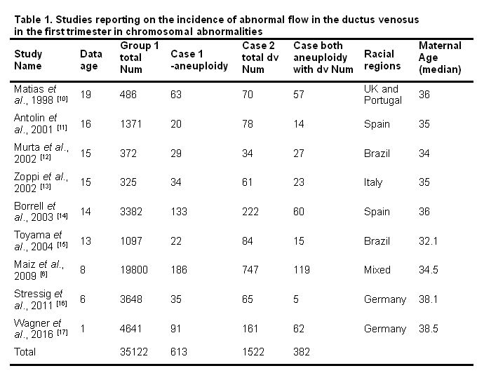 Table 1. Studies reporting on the incidence of abnormal flow in the ductus venosus in the first trimester in chromosomal abnormalities