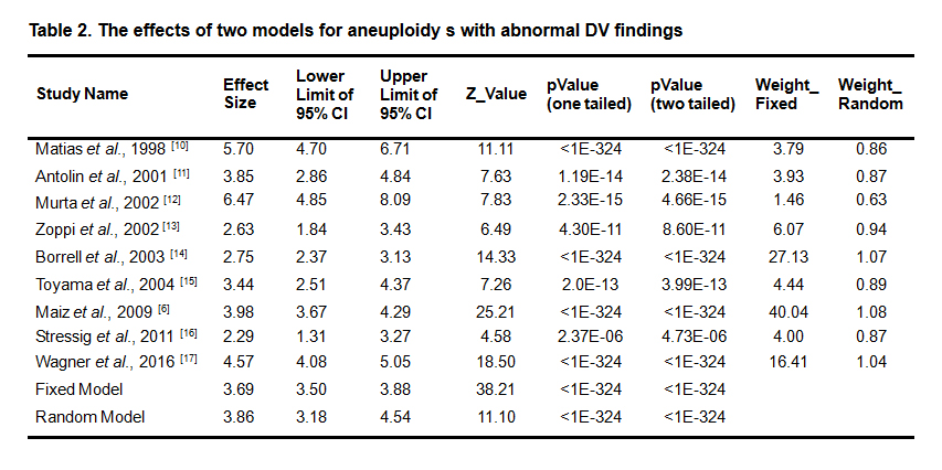Table 2. The effects of two models for aneuploidy s with abnormal DV findings
