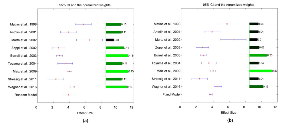 To compare the results from the two meta-analysis models, the mean LOR, its 95 % confidence interval (CI), and the weights used in each meta-analysis model are presented in Fig. 1. Although the fixed model and random model generate similar effect size (3.69 vs. 3.86), the 95 % CI of the fixed model is much smaller, leading to bigger Z-value than that of random model (38.21 vs. 11.10). The differences between the two models are also demonstrated in the weights, as shown in Fig. 1. The larger sample-sized studies tend to gain relatively smaller weights in the random model than that in the fixed-effect model.